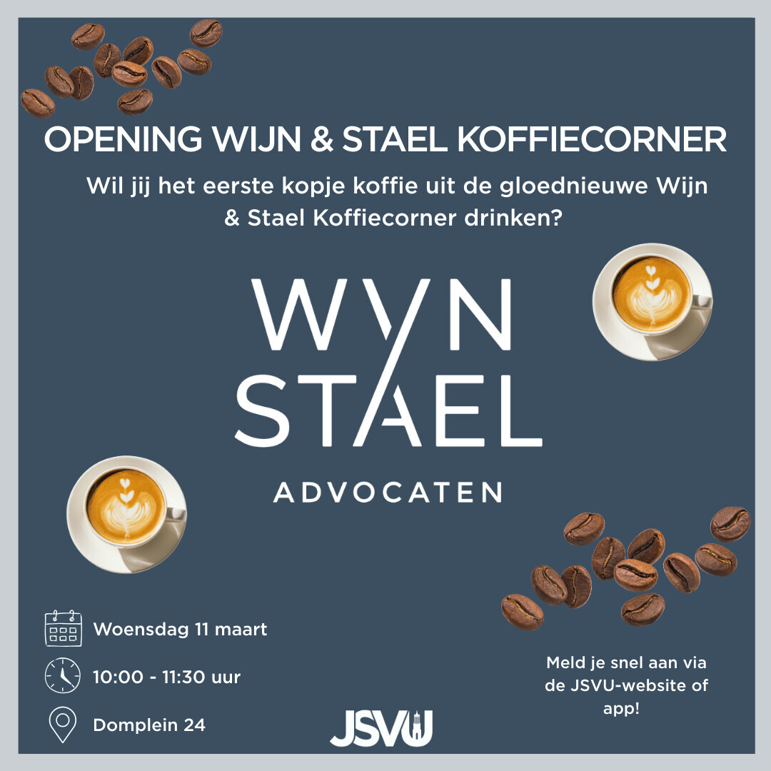 Op 11 maart opent in de Chillkamer van de JSVU de Wijn & Stael Koffiecorner. Leden kunnen hier voortaan gratis een kopje koffie halen als ze op de JSVU zijn voor vergaderingen, om readers op te halen of om gewoon even te chillen. Om dit te vieren, vindt op 11 maart de opening van de Wijn & Stael Koffiecorner plaats. In de aanwezigheid van advocaten van Wijn & Stael kun je komen genieten van de eerste kopjes koffie en wat lekkers.